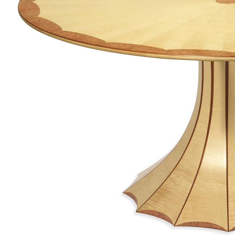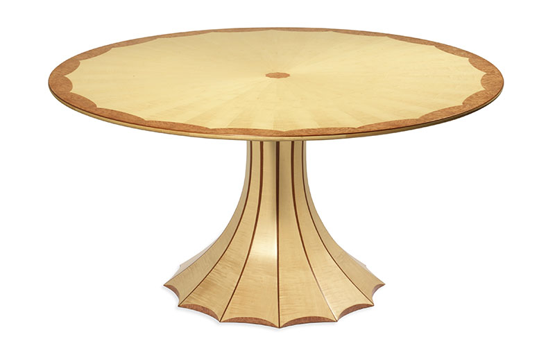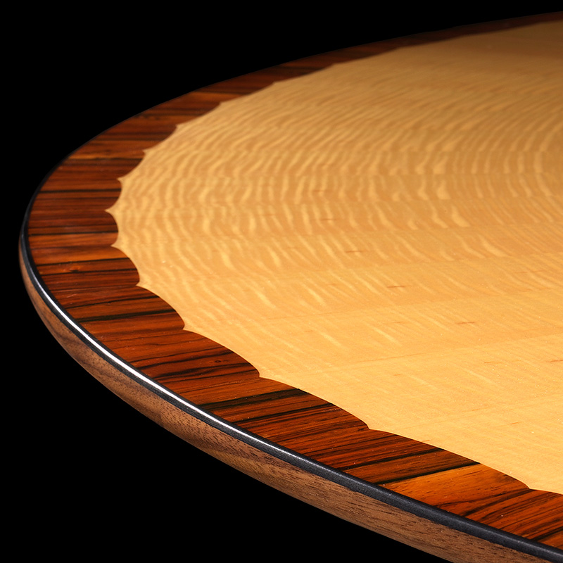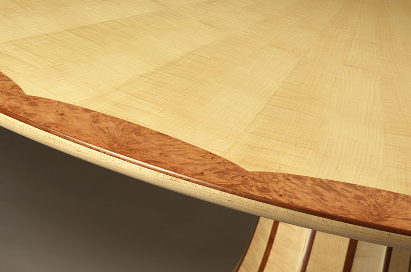 Circular dining table in Ripple Sycamore with burr Maple wave detail edging