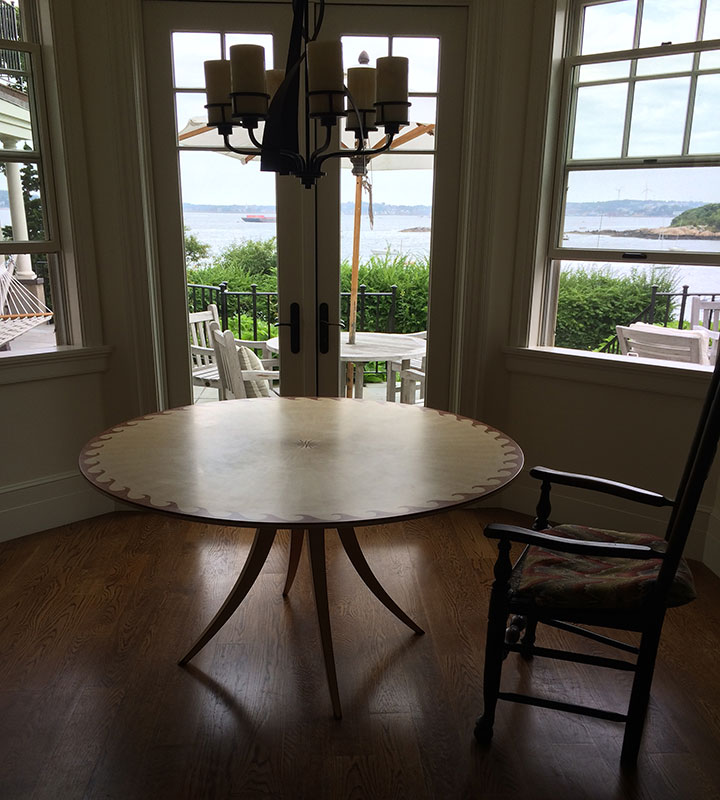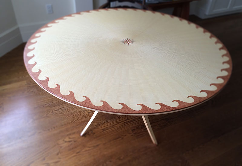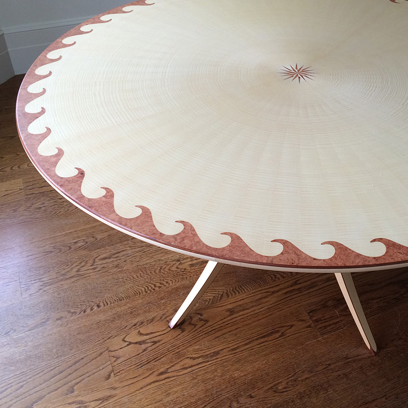 Commissioned by Anne Haley. Diameter 1350mm, height 695mm."We were first introduced to Marcus’s work when having dinner with friends. After admiring the dining table – an amazing tour de force of cabinetmaking – we contacted Marcus. "Marcus and I met and after several discussions of design and wood choices, we agreed to proceed with our commission. Bearing in mind that this table and base were being created in London, but made for an oceanfront home in the US, there were some minor trepidations. However, the table top – with an adapted Vitruvian wave inlay around the edge – and the base, arrived safely. Marcus had made the process of joining the two pieces together a simple one. "My husband and I are thrilled with our purchase – and it has stood up well to constant use and attention." Anne Haley