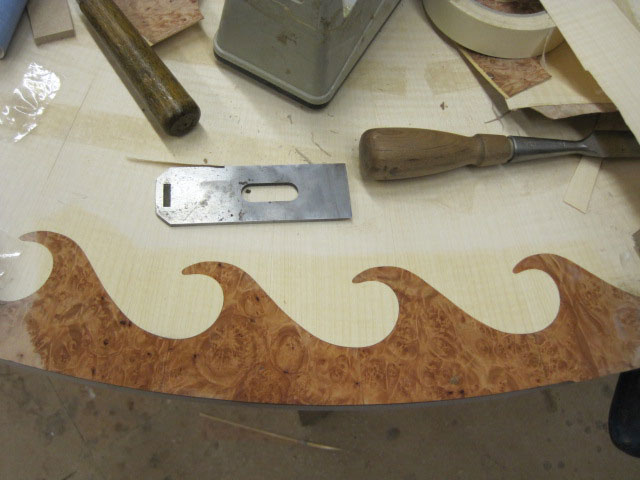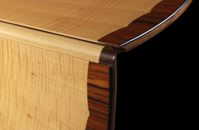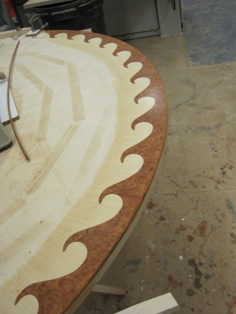 Circular table in ripple Maple veneer with burr Maple edge detail and Mahogany stringing