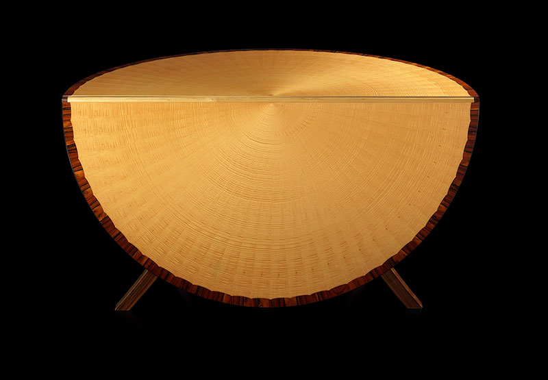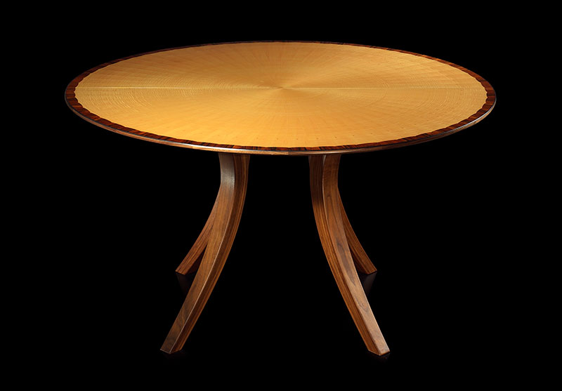 Commissioned by Justin and Francesca Urquhart Stewart. Shown at Cheltenham Celebration of Craftsmanship and Design. Diameter 1270mm, 695mm high."We asked for a table, and what we received was the most astonishing creation of beautiful design and perfect craftsmanship. Marcus has not just built us a table but created an heirloom for our family that will outlive us all and be admired for generations as a frankly exquisite dining room table which all who sit around has and will admire and appreciate. "Marcus included us in both the design and the selection of wood and veneer so that we were thoroughly involved in the whole process. "We used a small inheritance to pay for this and Marcus created such a table that will forever be a beautiful recollection of my wife's most talented and beautiful mother."